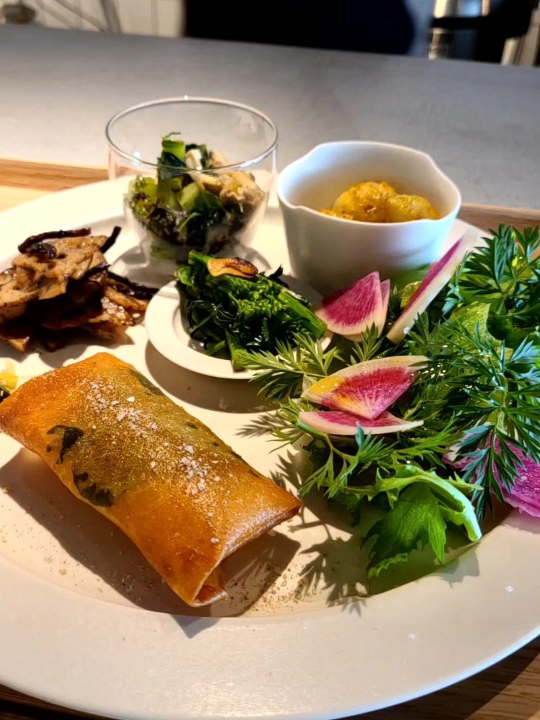 自然栽培のお米や有機・農薬不使用の野菜を主に使用した身体に優しいごはんのランチが味わえます。取材時は、きぬむすめ 玄米とあおさの味噌汁に大根人参の春巻き、蒸し里芋のスパイスあえ、ひじきれんこんなど、新鮮な野菜の素材を活かした美味しいランチが楽しめました。