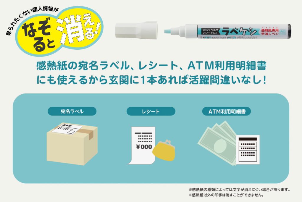 感熱紙の宛名ラベルやレシートに印字された文字をペンでなぞるだけで、無色化でき、そのまま廃棄が可能となります。